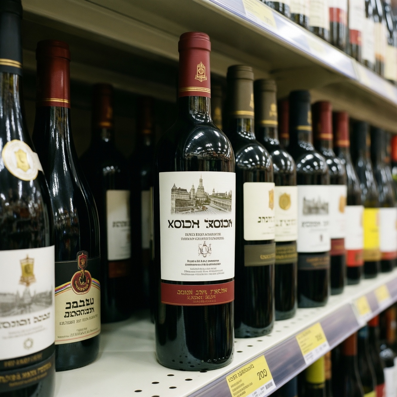 Кошерное вино (не mevushal) Хехшер + "Kosher"; иногда пометки о производстве/розливе под надзором Чаще в специализированных точках и у импортеров; в обычной рознице - эпизодически Средний/премиальный